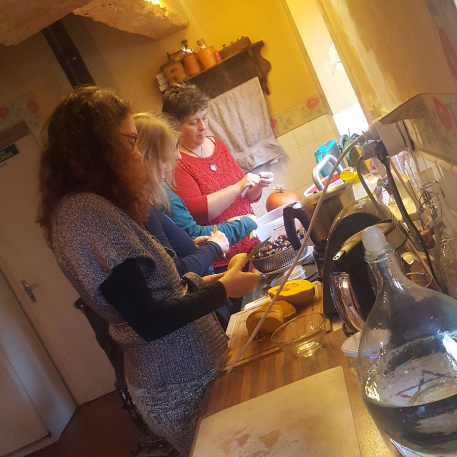 Pour ce premier atelier nous avons concocté une soupe de butternut et châtaignes en entrée, ensuite nous avons appris à faire le fameux plat de légumes de saisons de Brigitte et nous avons fini par des crèmes de coco sur son lit de crème de marron.